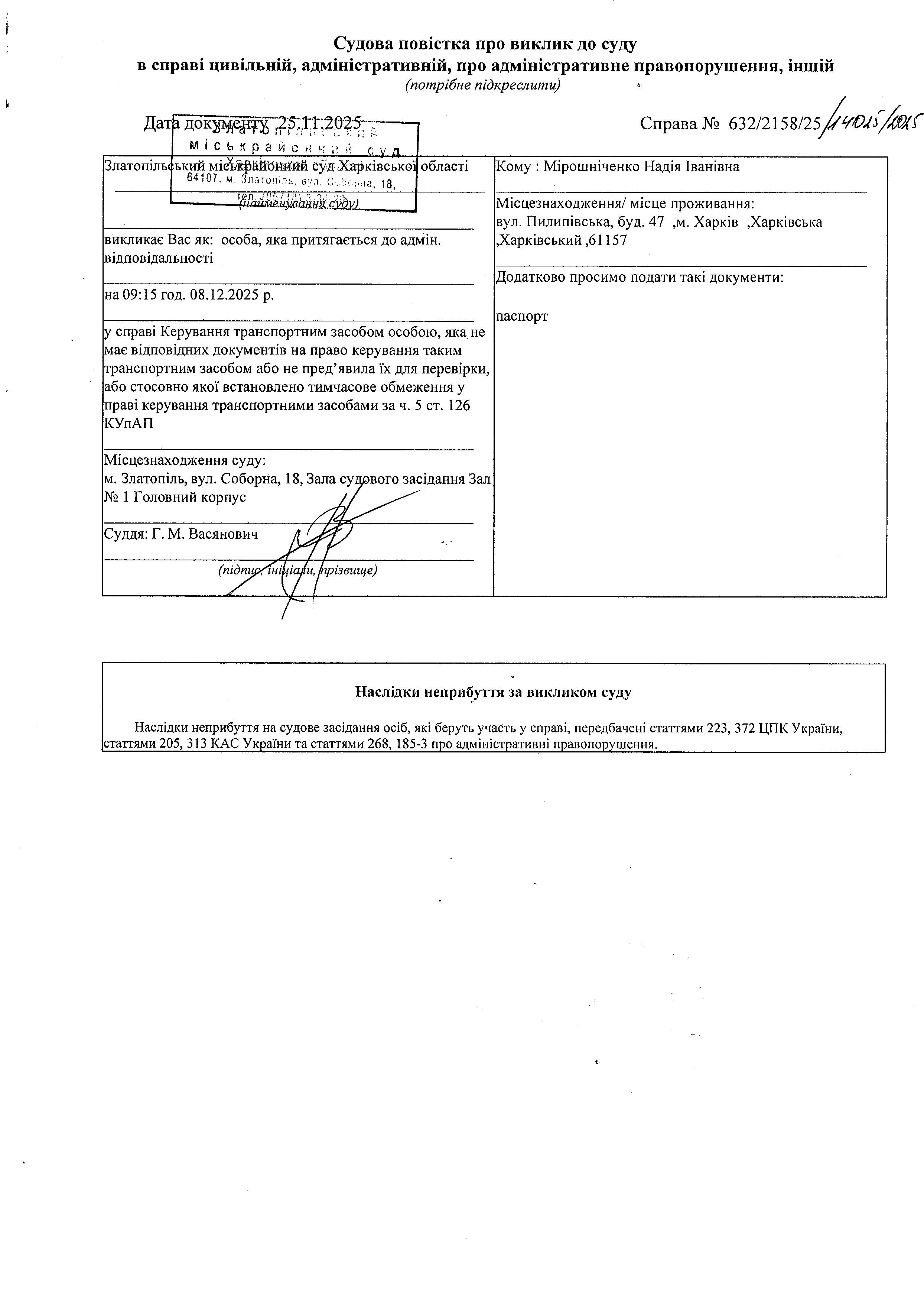 Виклик Мірошніченко Н.І.