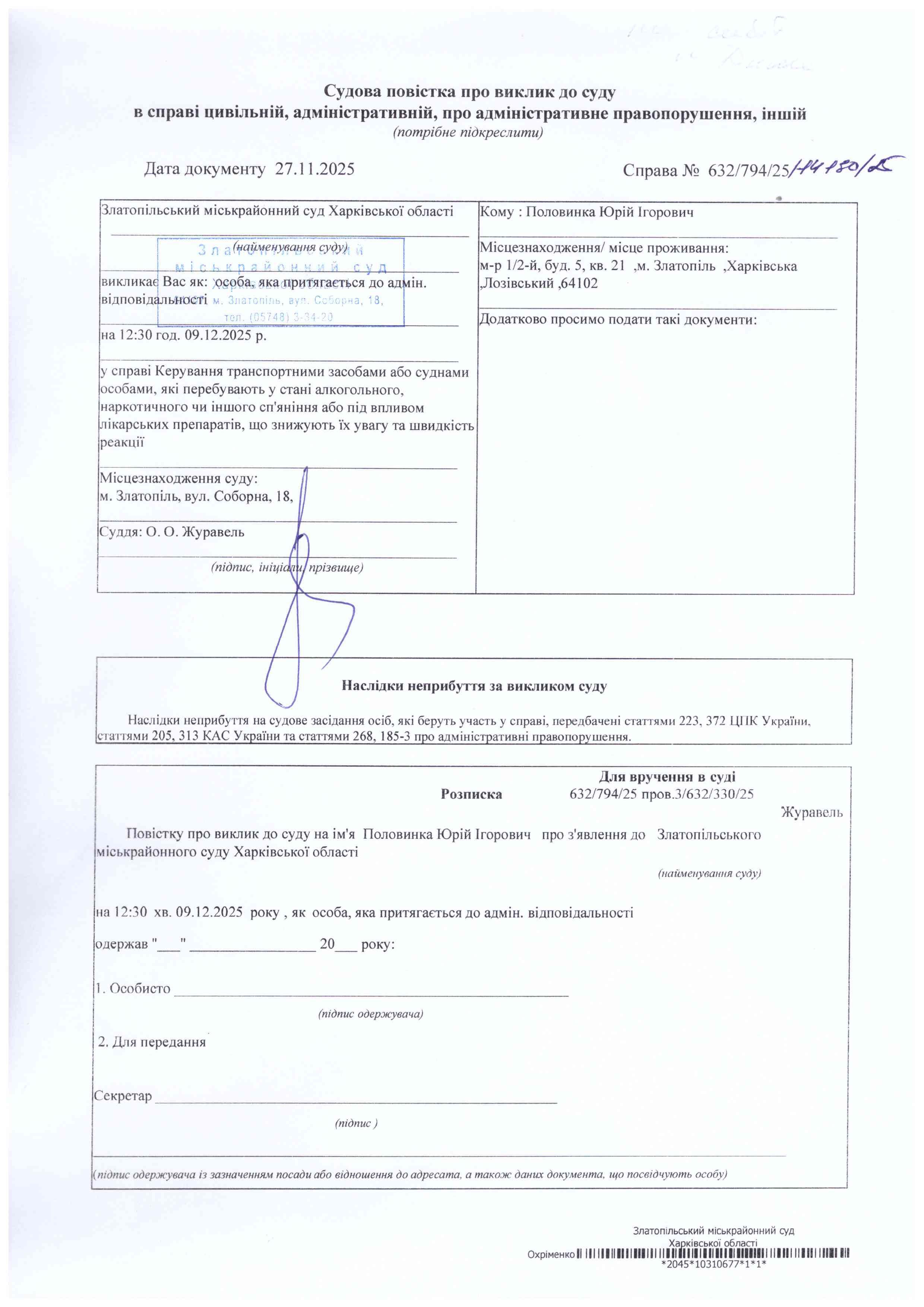 Виклик Половинка Ю.І.